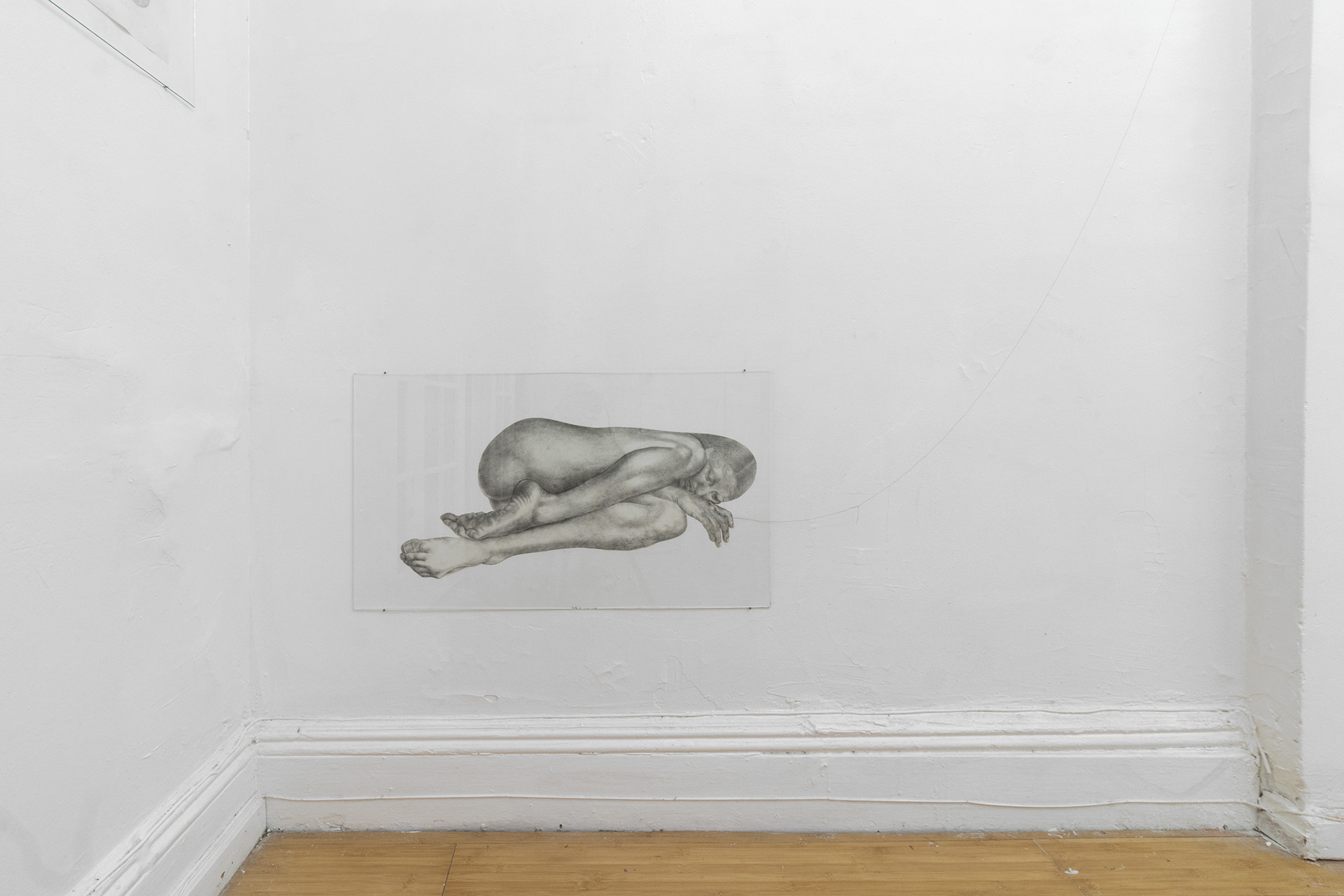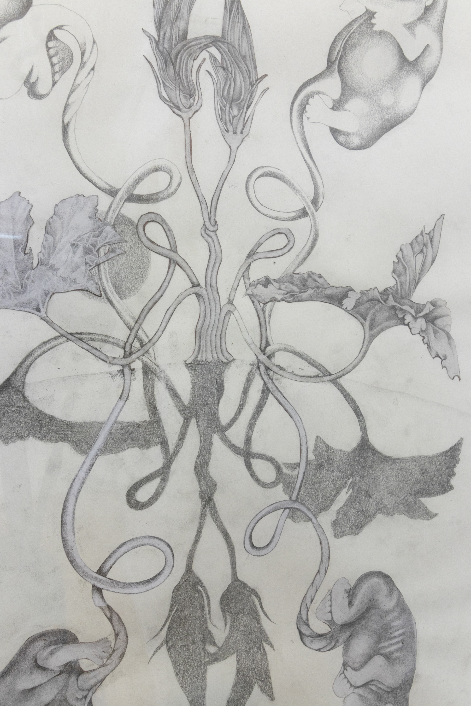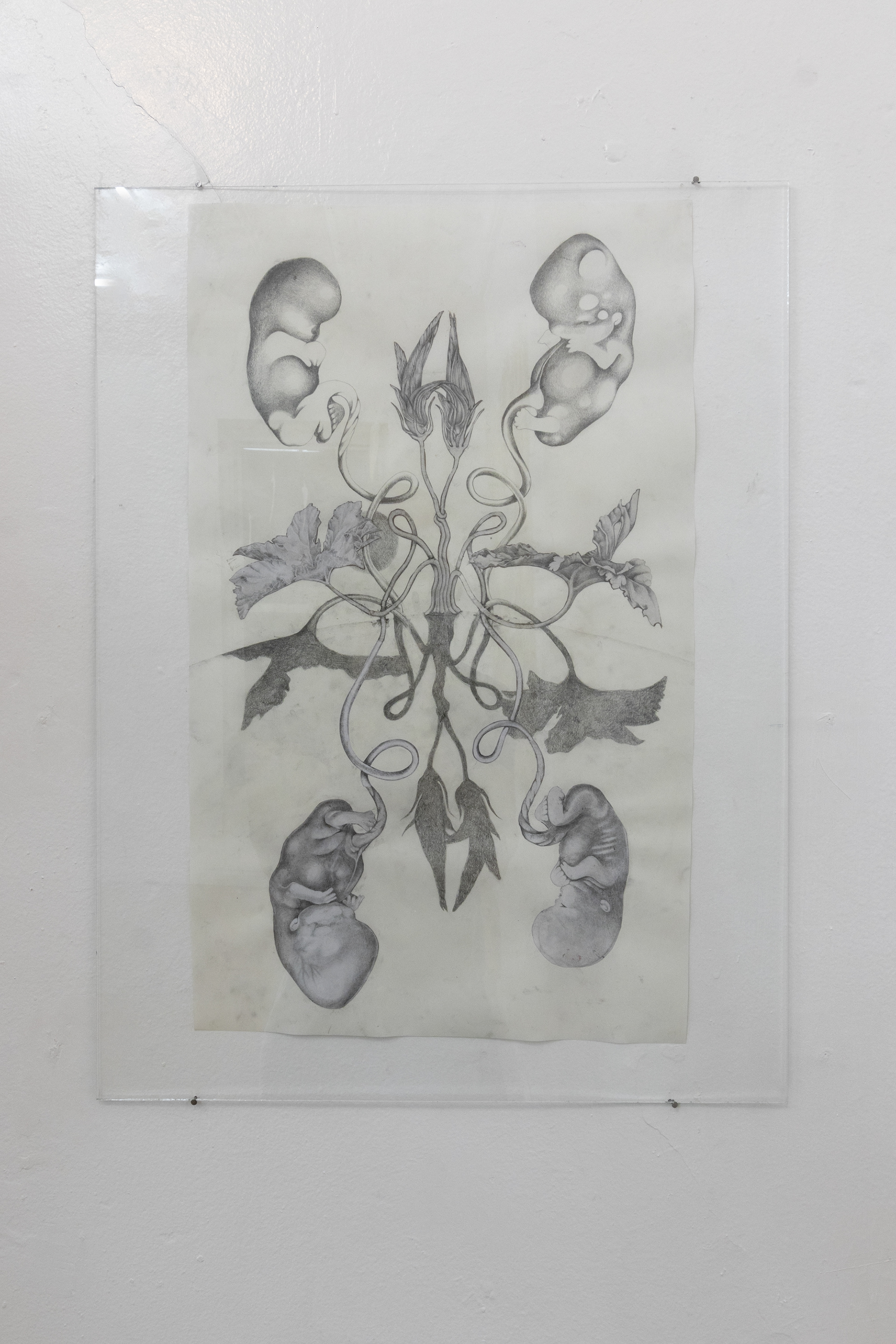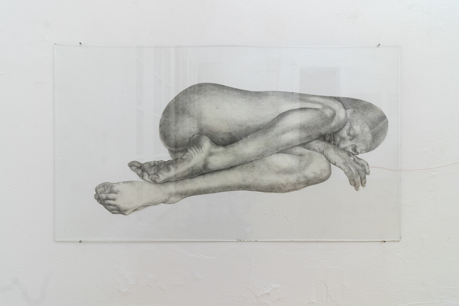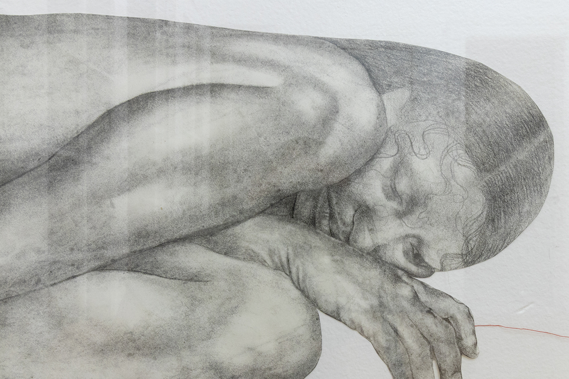 graphite on cut paper, 26 x 12 inches (glass: 30 x 17 inches)