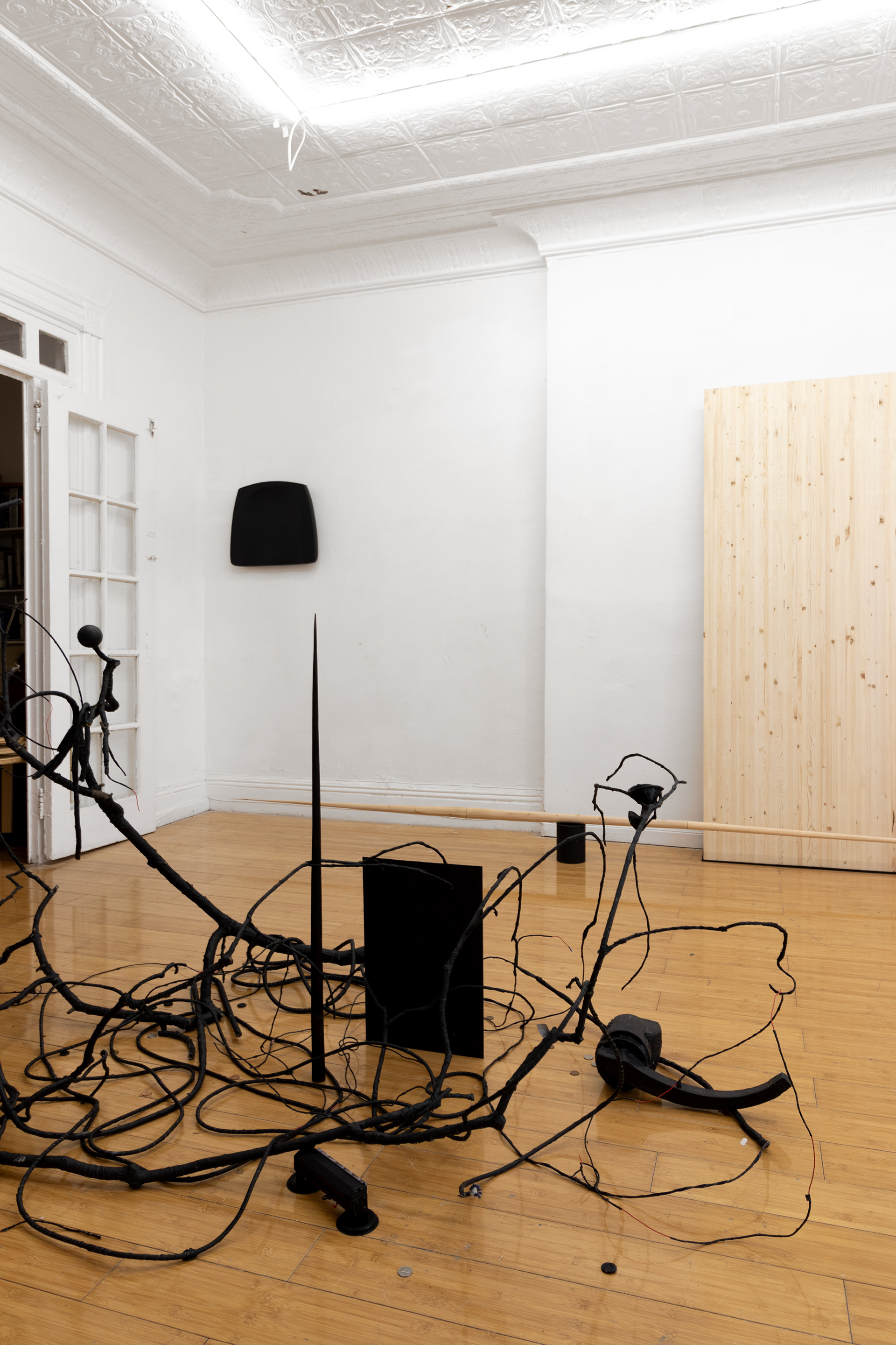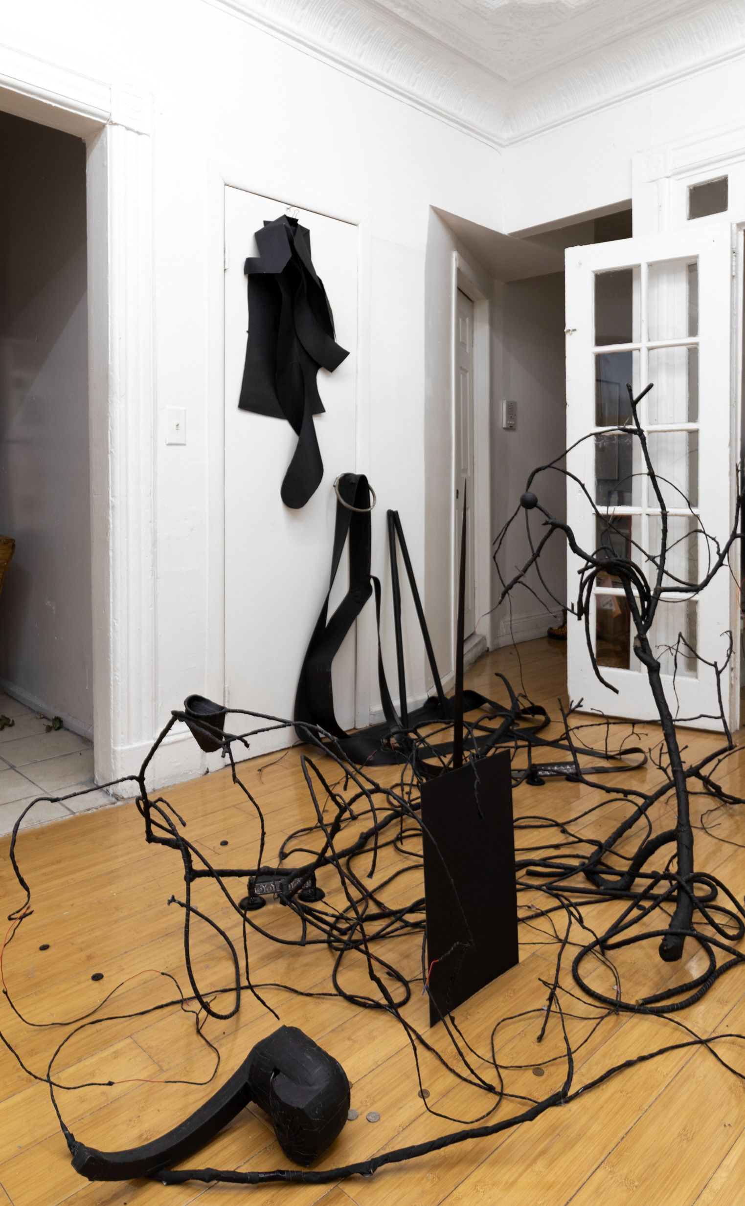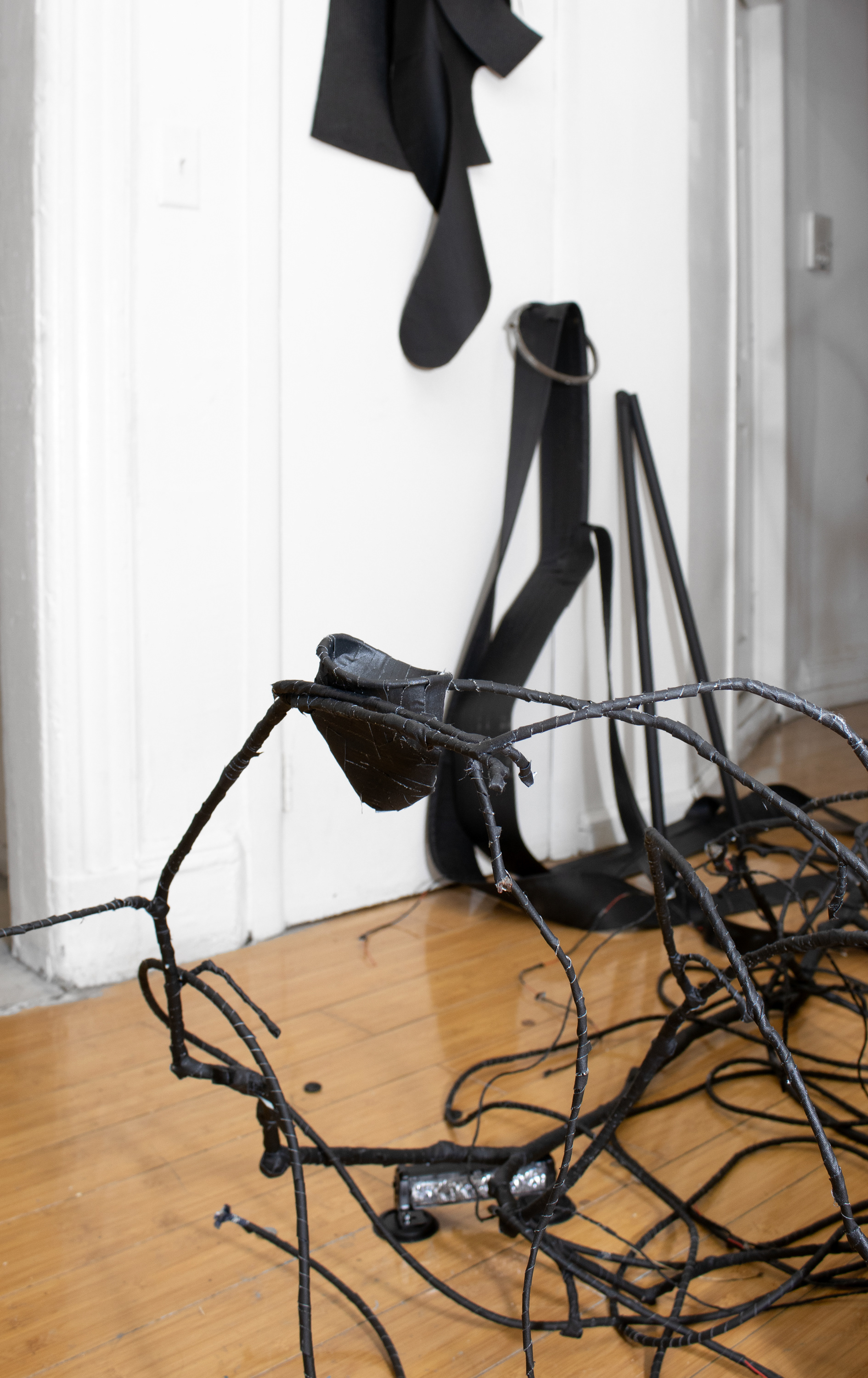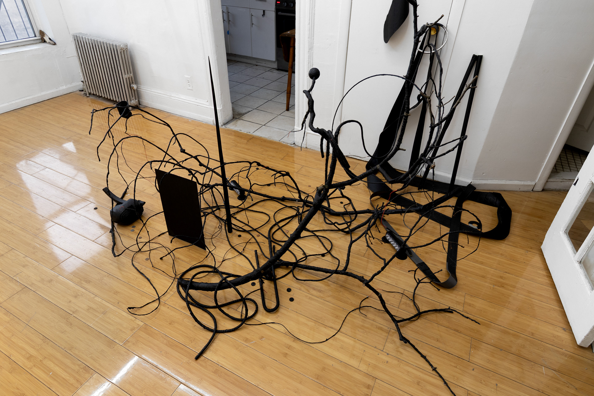 Why What?, 2026, gaffer tape, wood, rope, wire and mixed media, dimensions variable