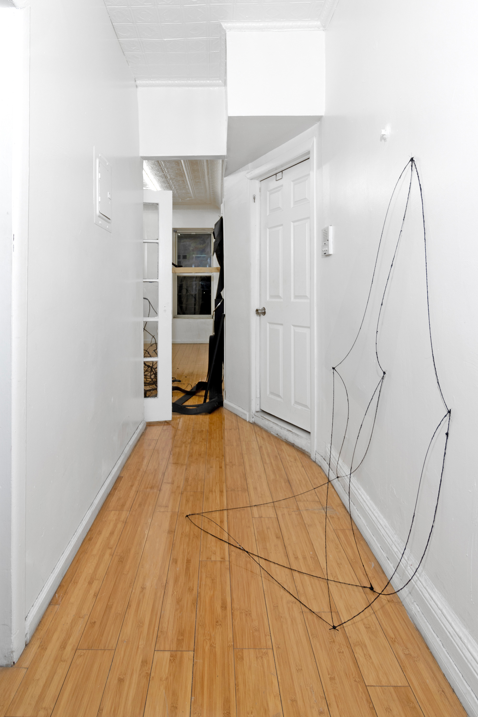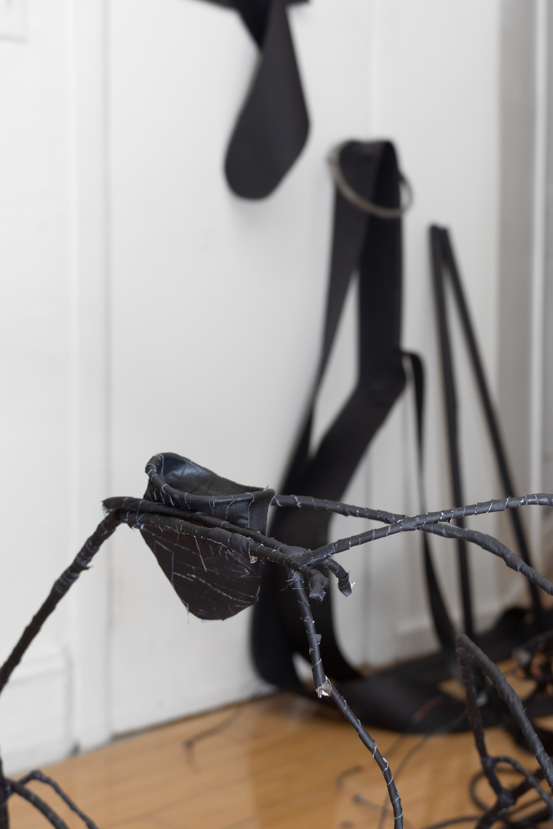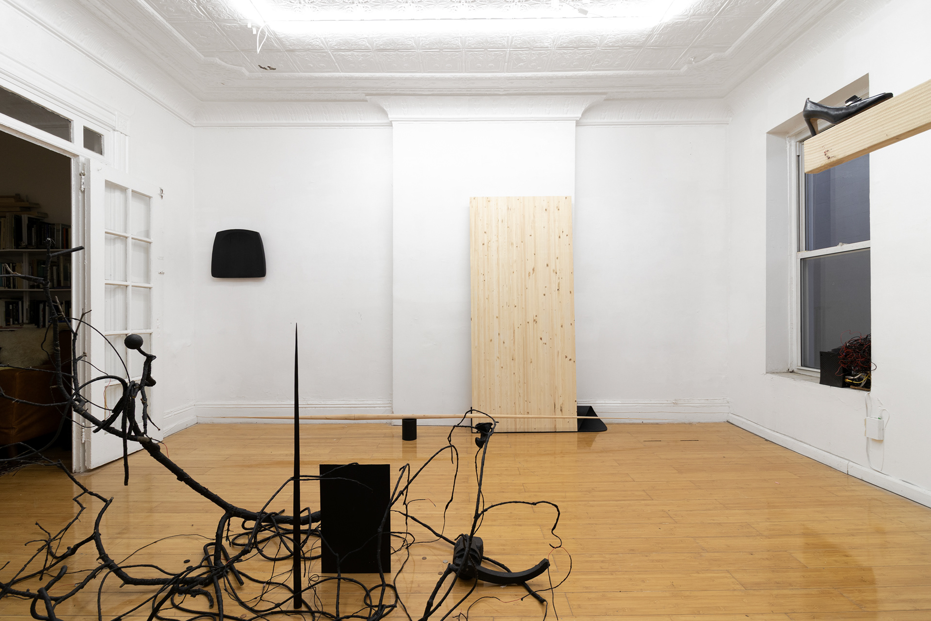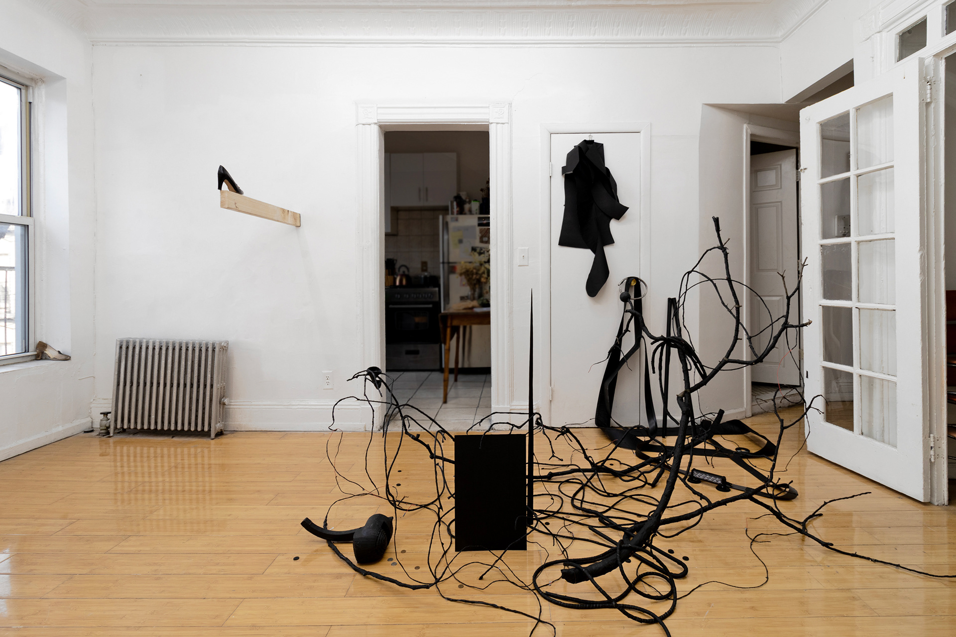 Why What?, 2026, gaffer tape, wood, rope, wire and mixed media, dimensions variable