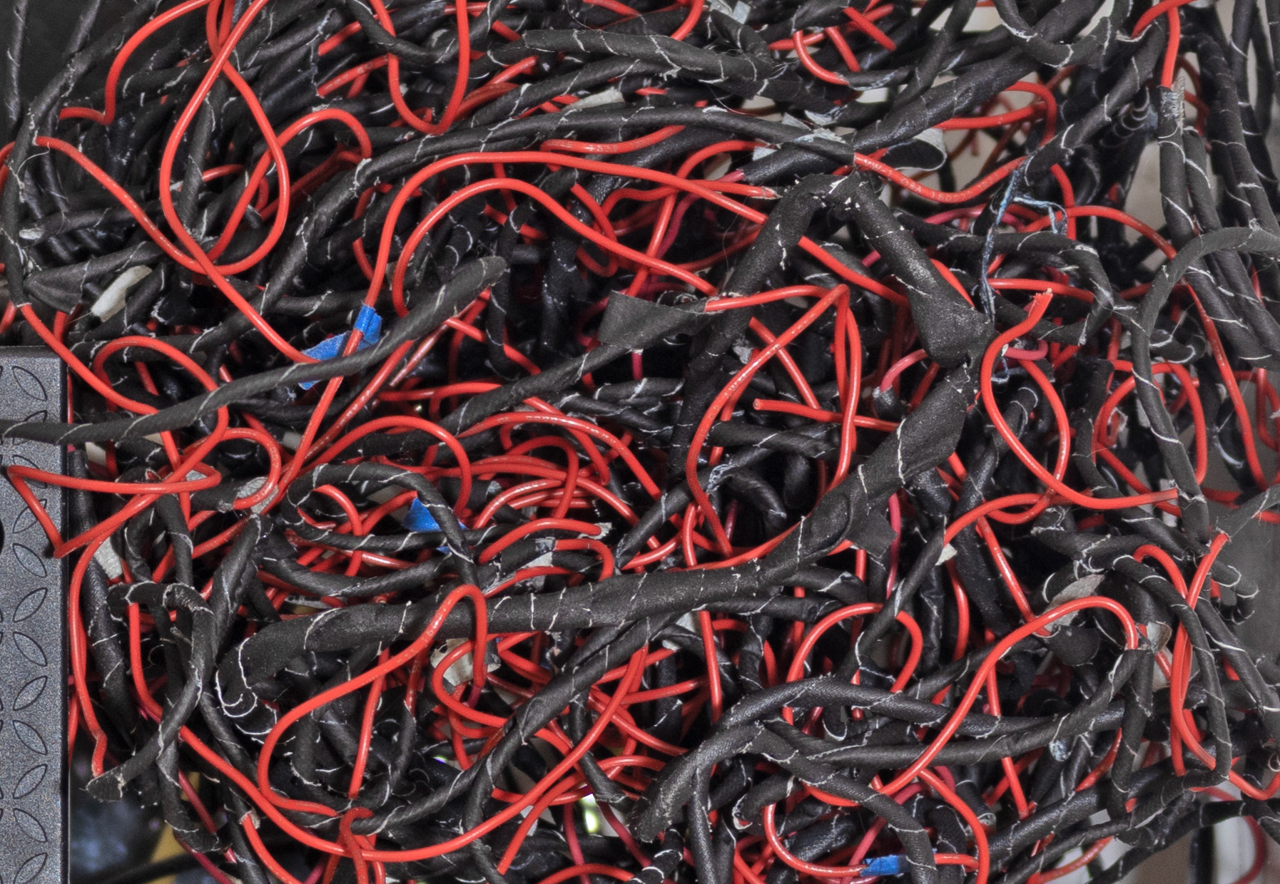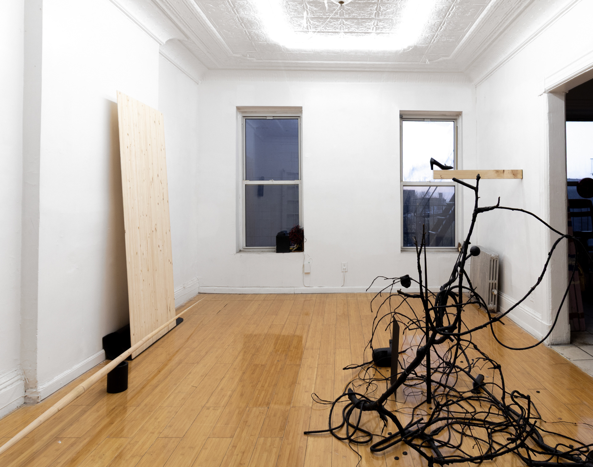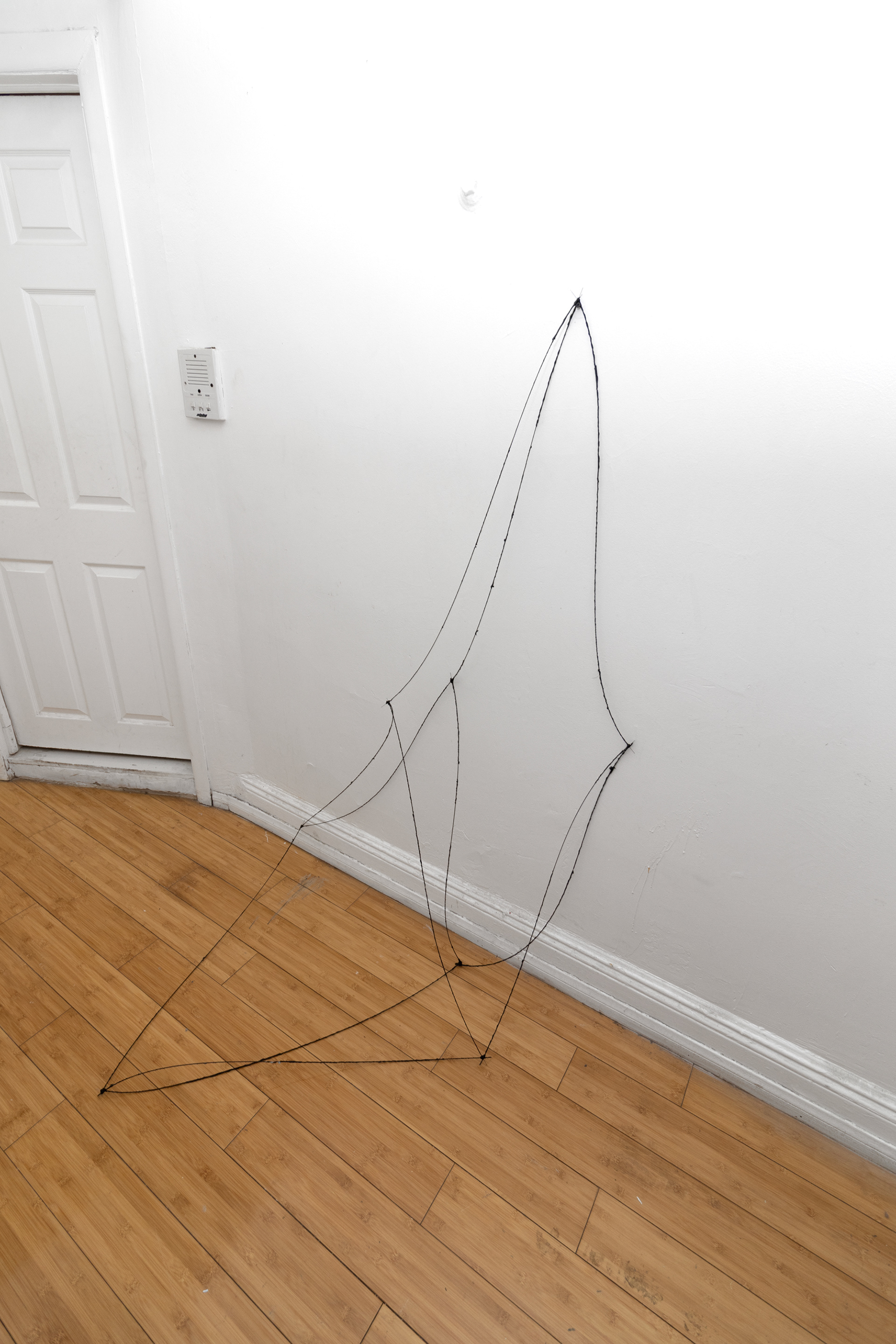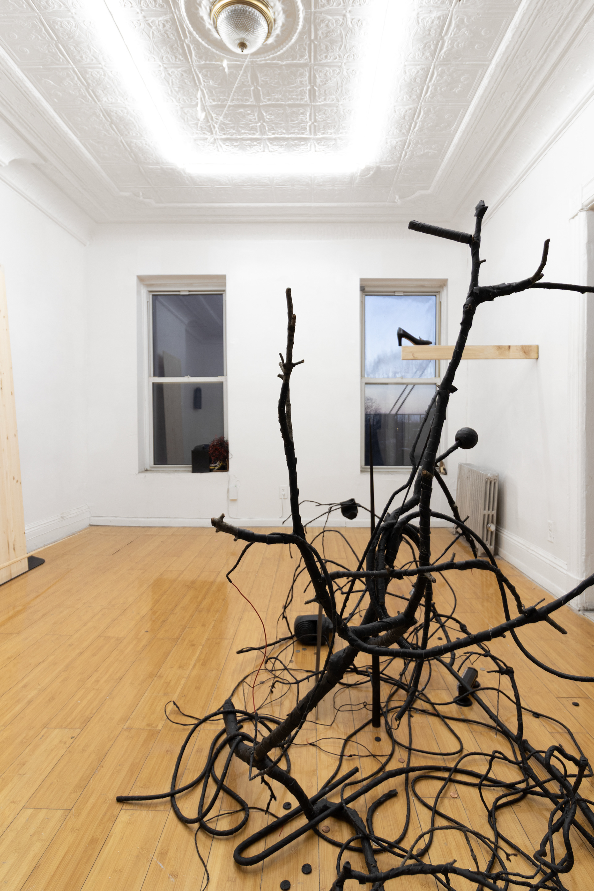Why What?, 2026, gaffer tape, wood, rope, wire and mixed media, dimensions variable